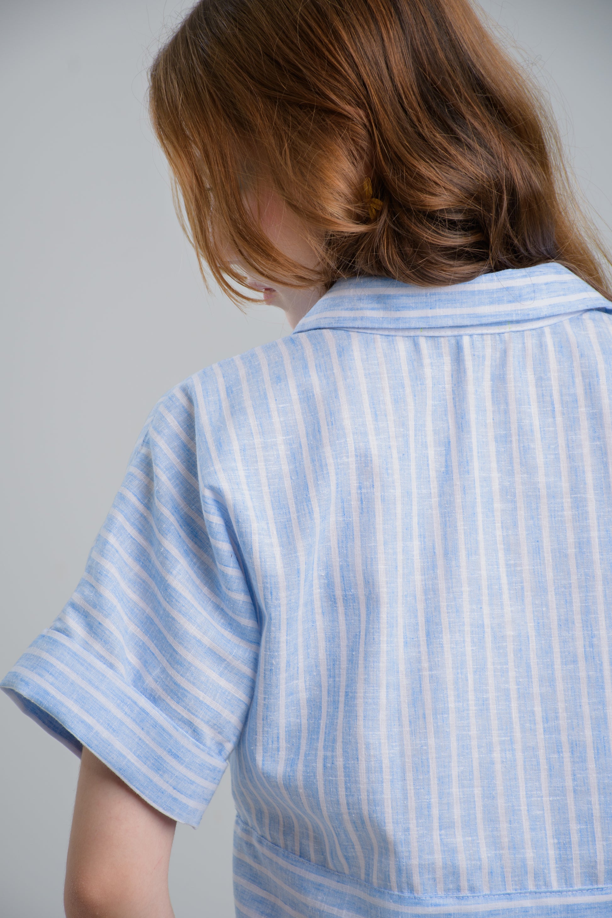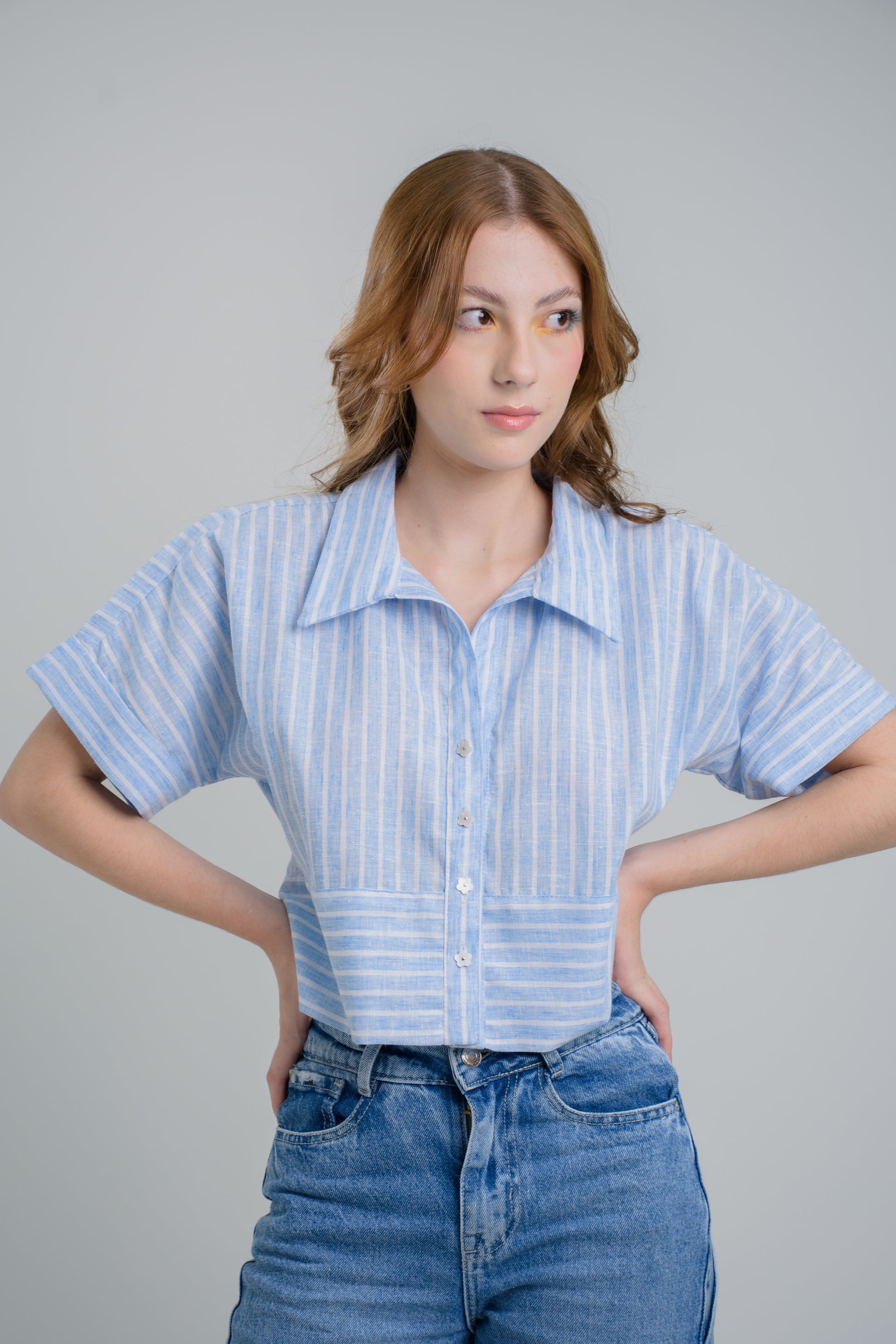 Nuestra Camisa Eco posee una silueta relajada, recta y ligeramente estructurada, el diseño combina rayas verticales y horizontales que juegan con el sentido visual de la tela. El cruce delantero cuenta con botones de de flor en nácar, que refuerzan su estilo contemporáneo. Es una prenda liviana y suave al tacto, ideal para climas cálidos.