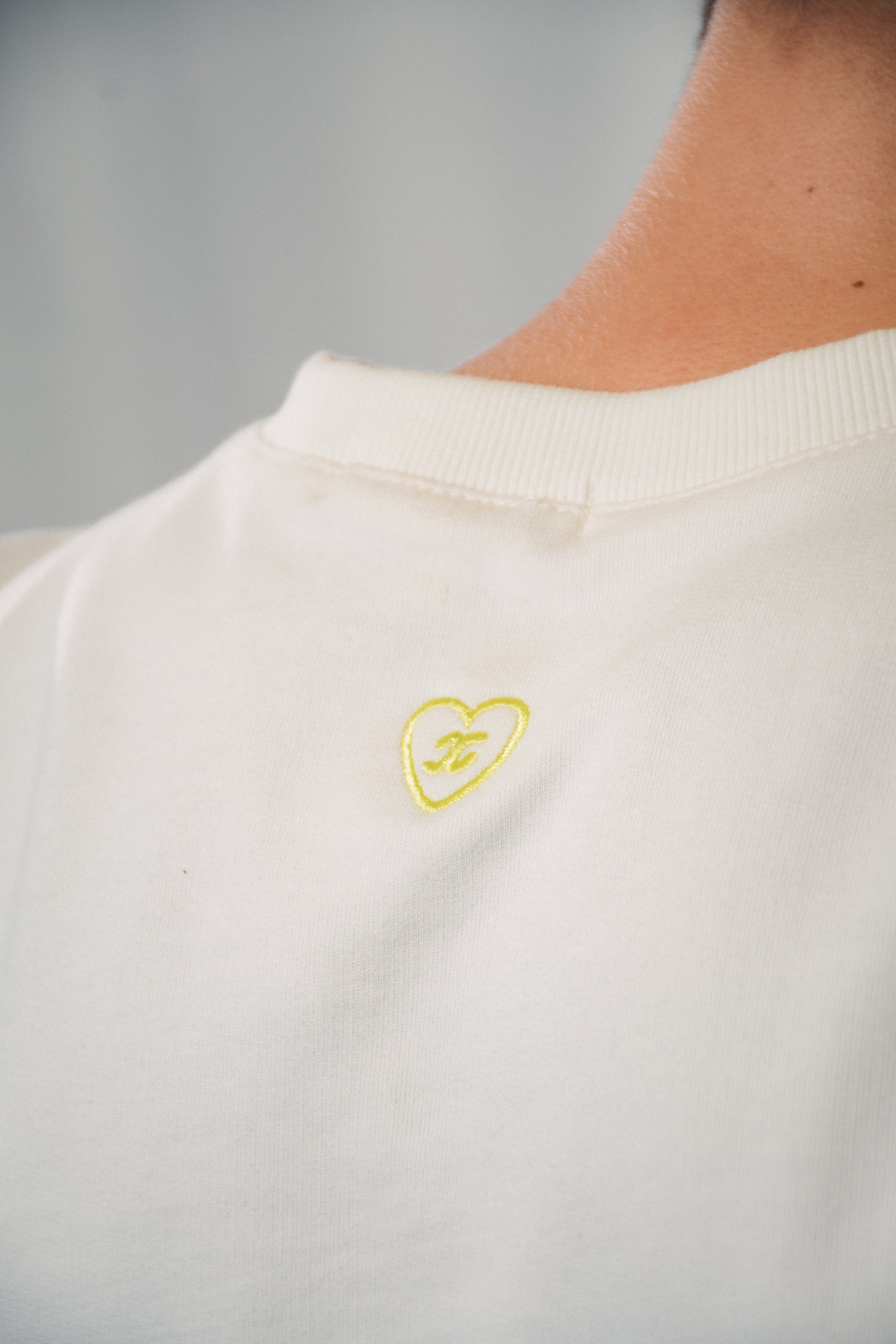 El detalle distintivo lo lleva en la espalda: un bordado en hilo verde flúor con nuestro símbolo de corazón y la "x" de cincoxciento, que representa perfecto nuestra identidad de marca. Un gesto simple, íntimo y especial.