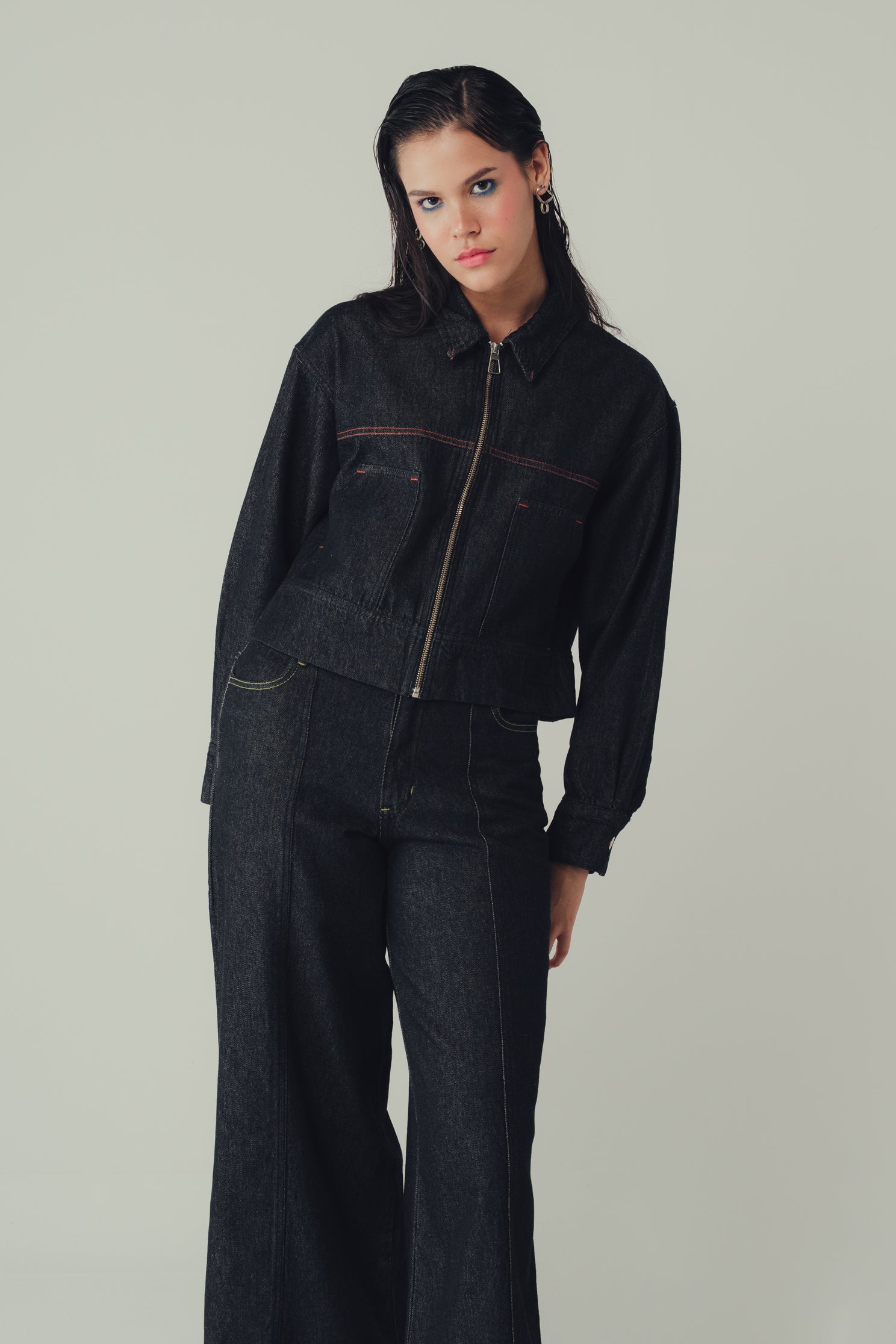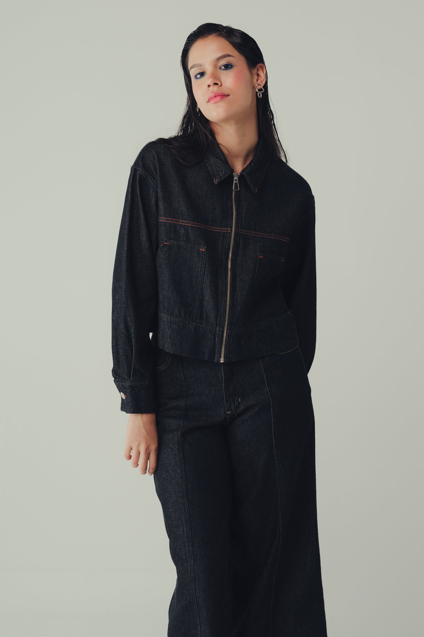 Nuestra Chaqueta Latido Pimienta nace desde el ADN de cincoxciento: el detalle como lenguaje. De silueta recta y fit amplio, con cierre frontal silver.