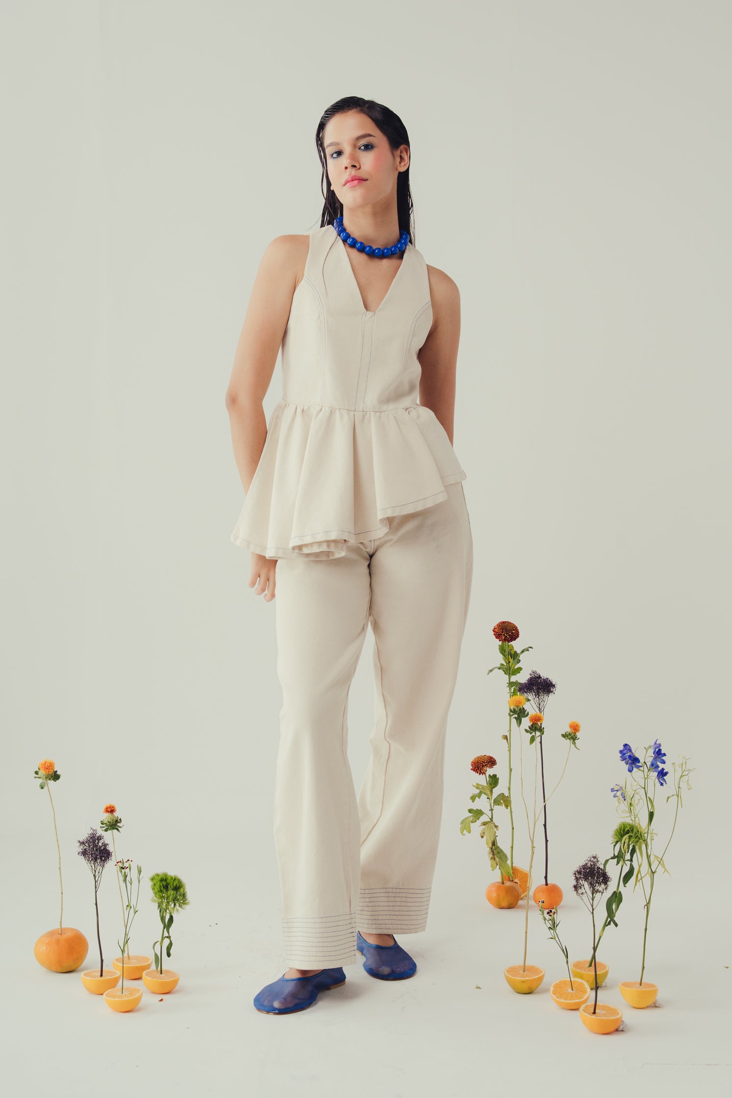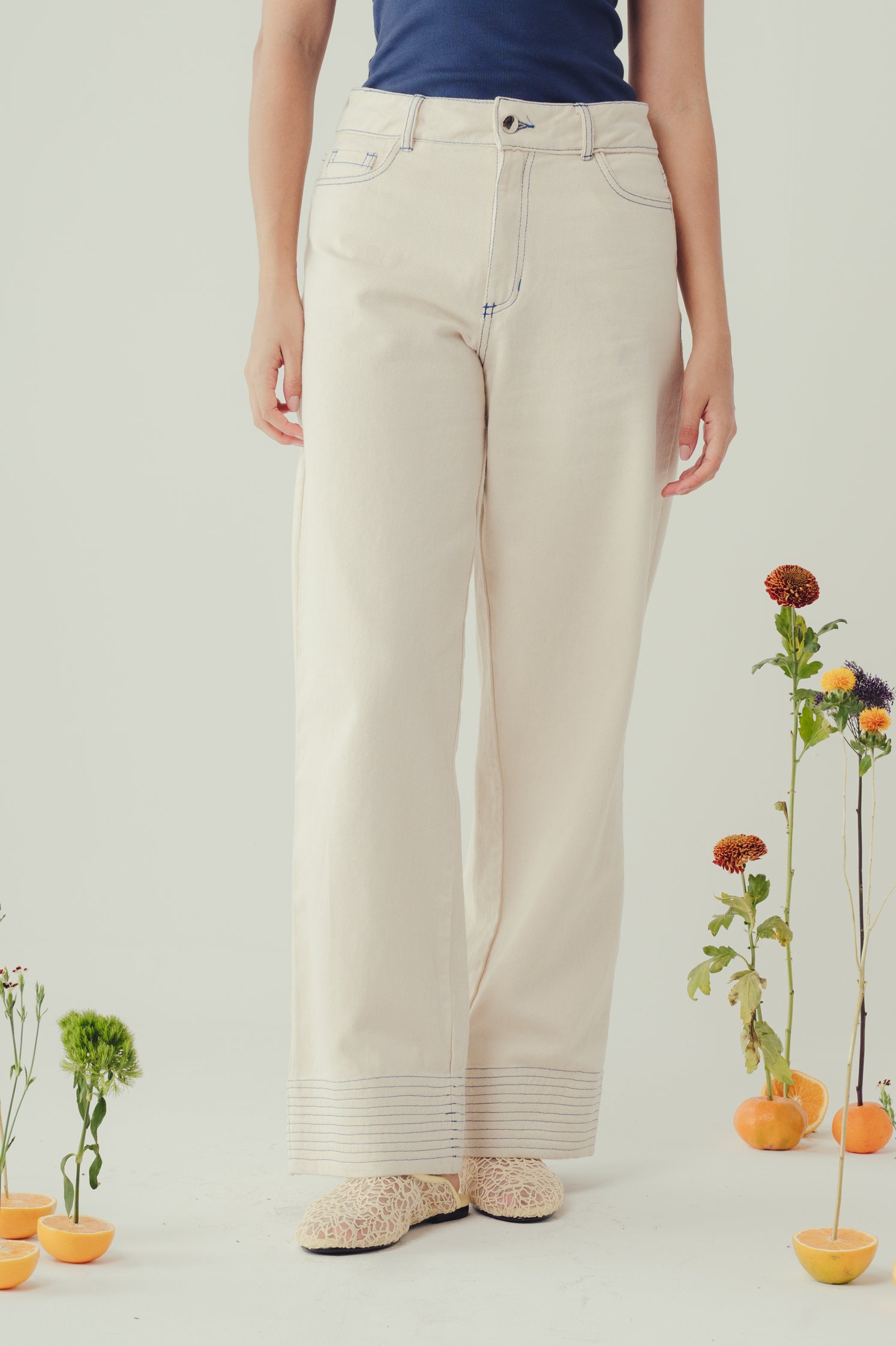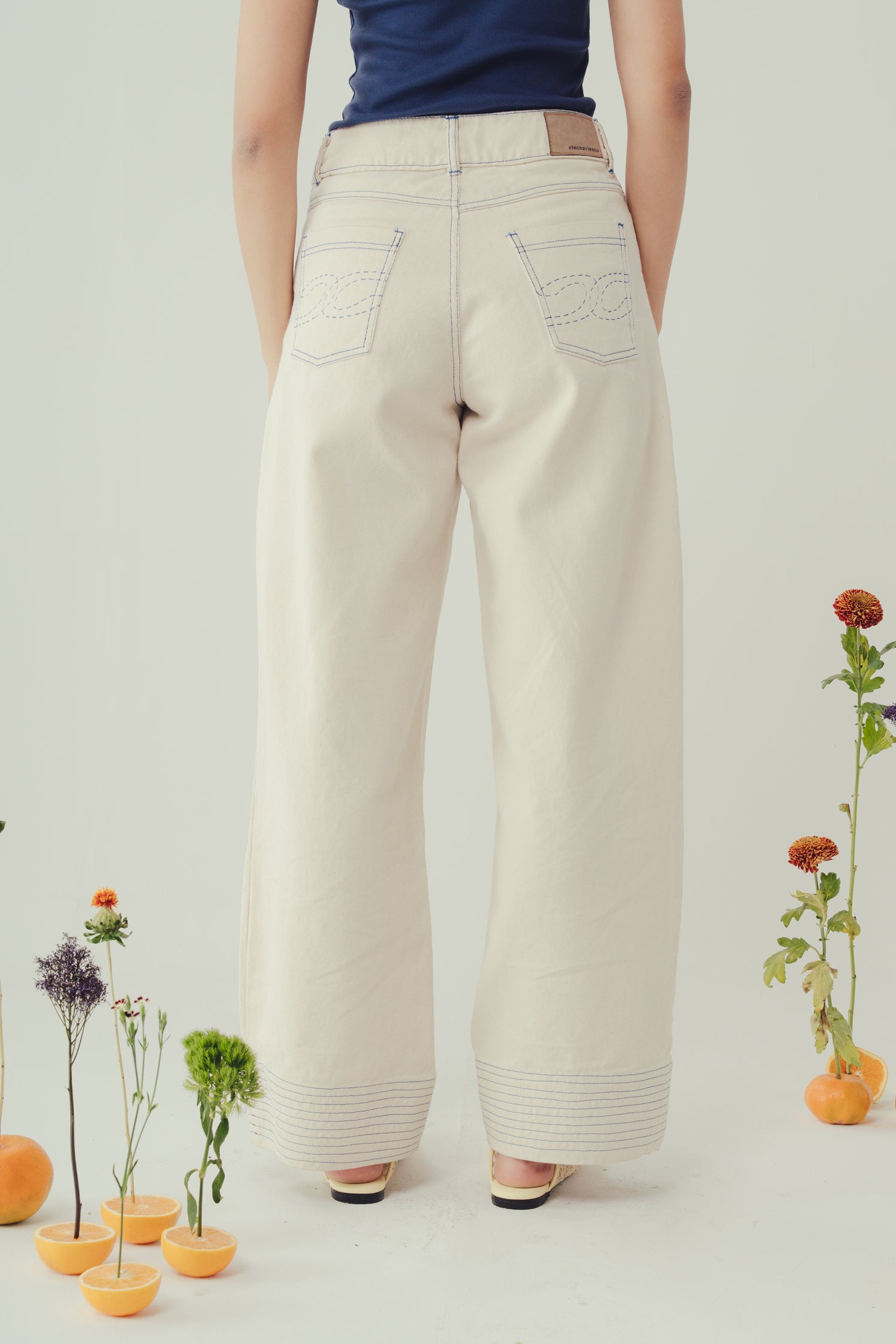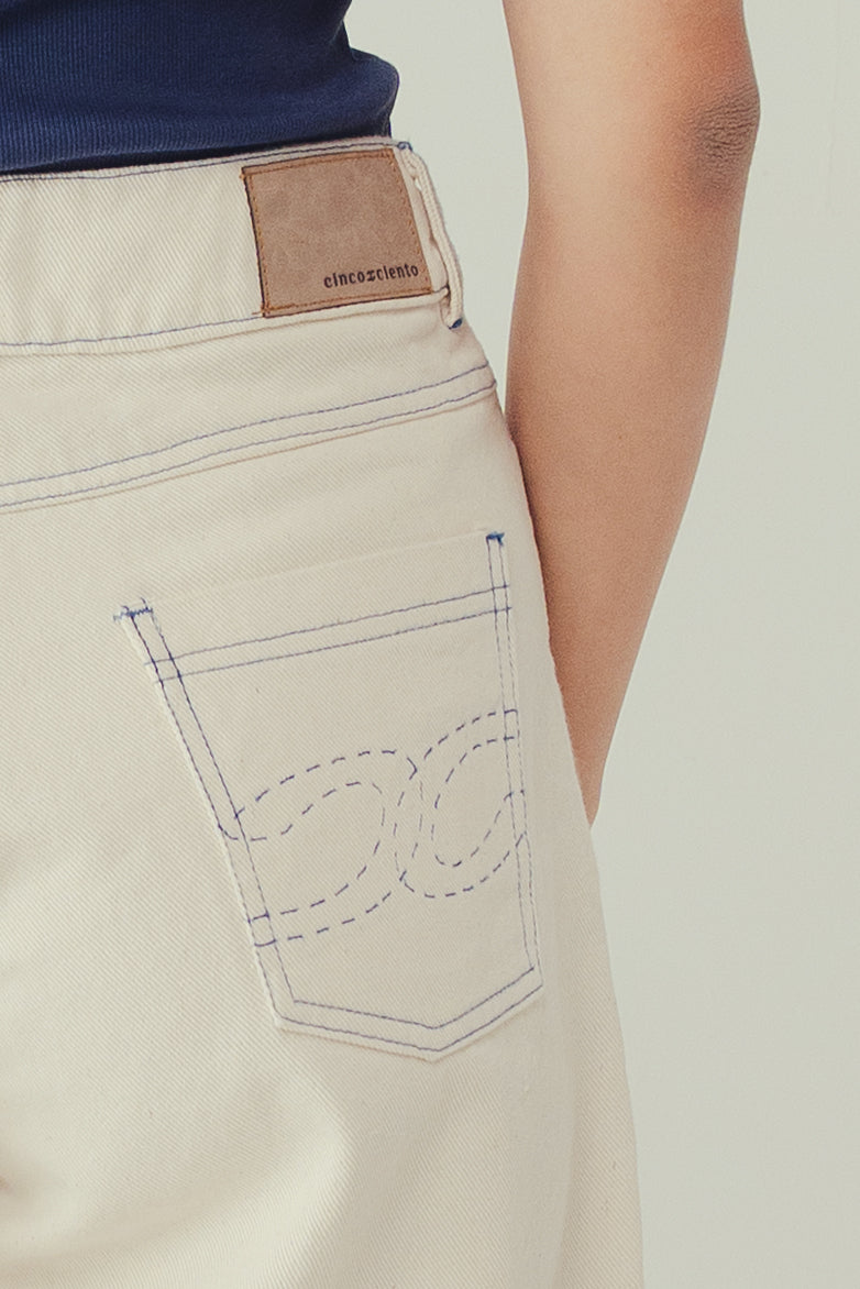 Nuestro Jean El Tacto Crudo es un jean de tiro alto y silueta amplia, con un dobladillo protagonista con pespuntes visibles de color azul que aportan identidad y una terminación cuidada.