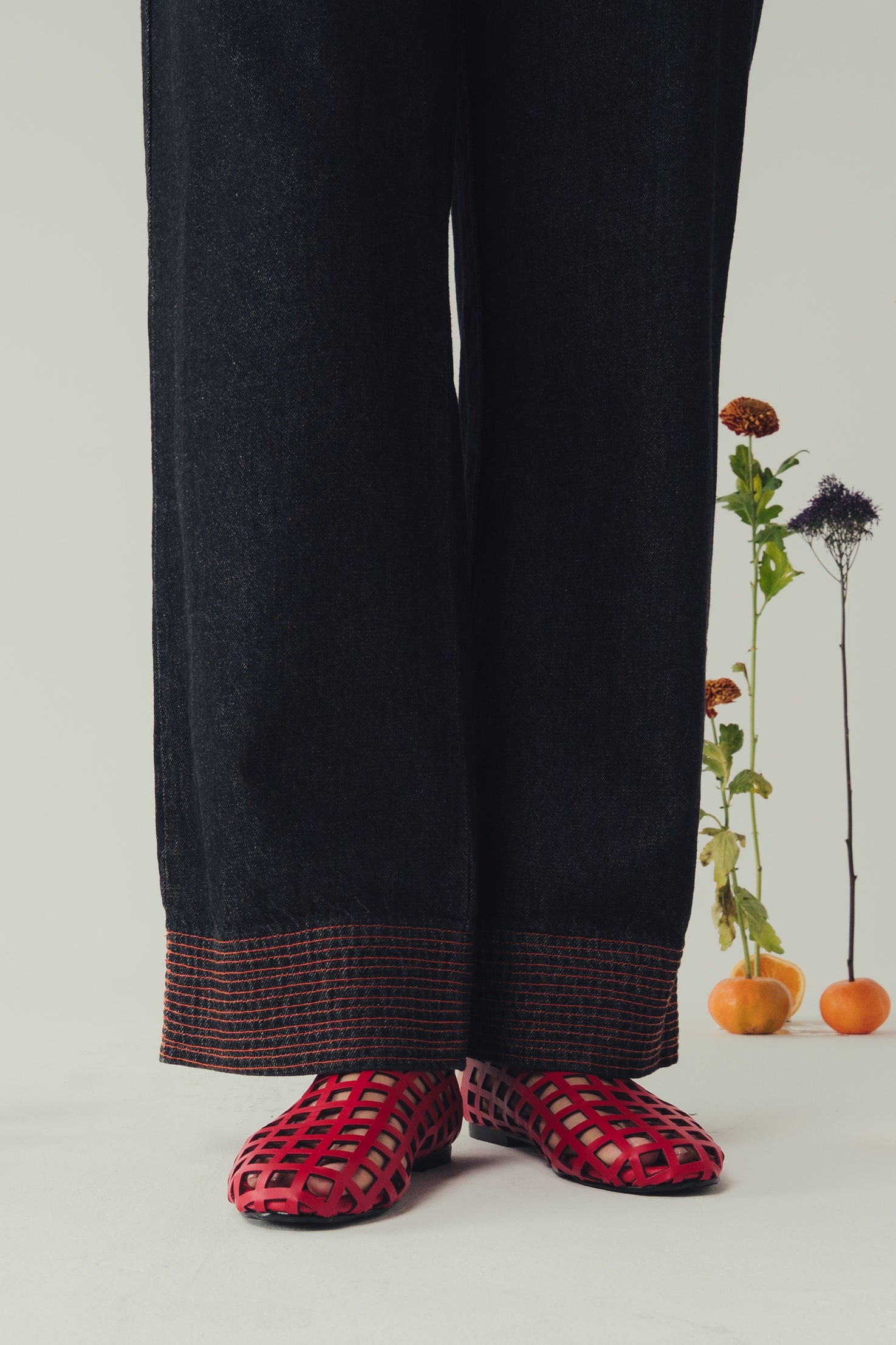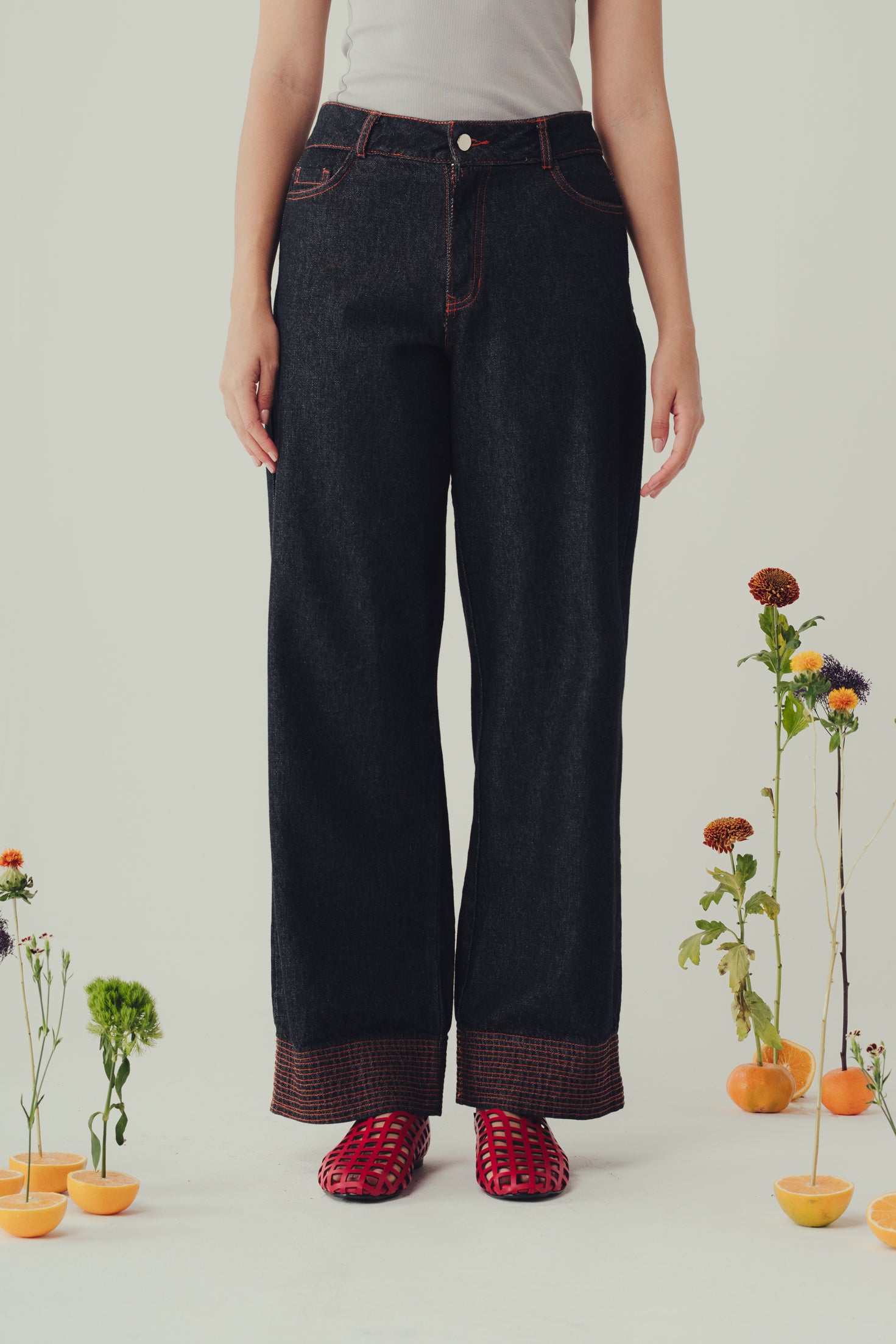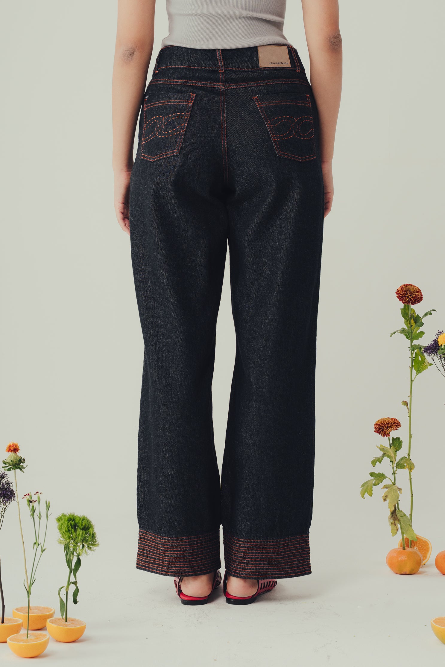 Nuestro Jean El Tacto Crudo es un jean de tiro alto y silueta amplia, con un dobladillo protagonista con pespuntes visibles de color naranja que aportan identidad y una terminación cuidada.