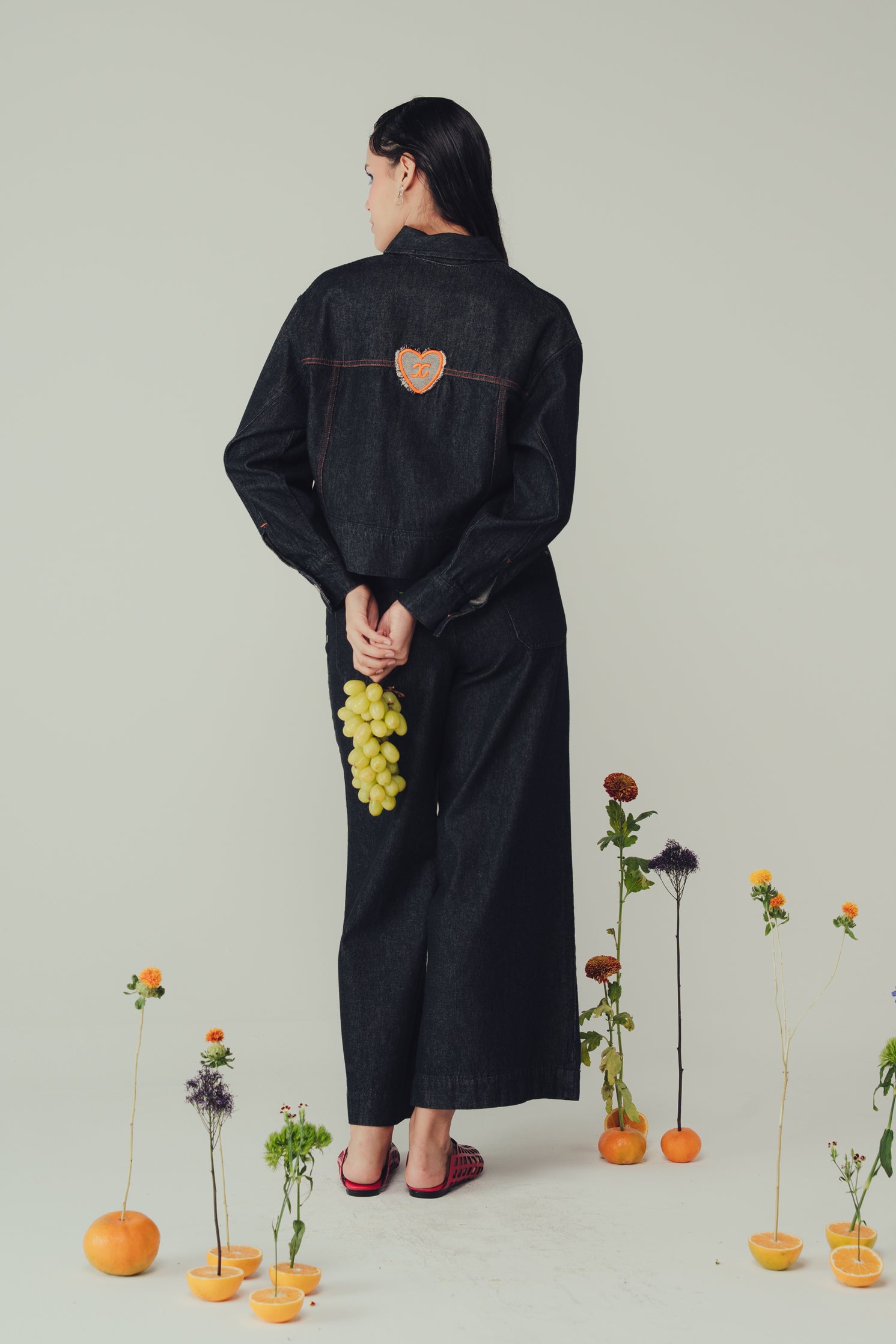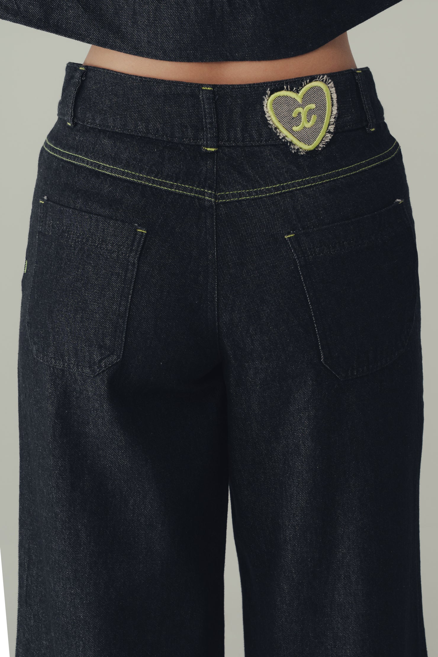 Cuenta con bolsillos posteriores de líneas limpias, integrados a la silueta, y en la parte trasera incorporamos nuestro parche corazón, un detalle distintivo que conecta la prenda con el universo cincoxciento.