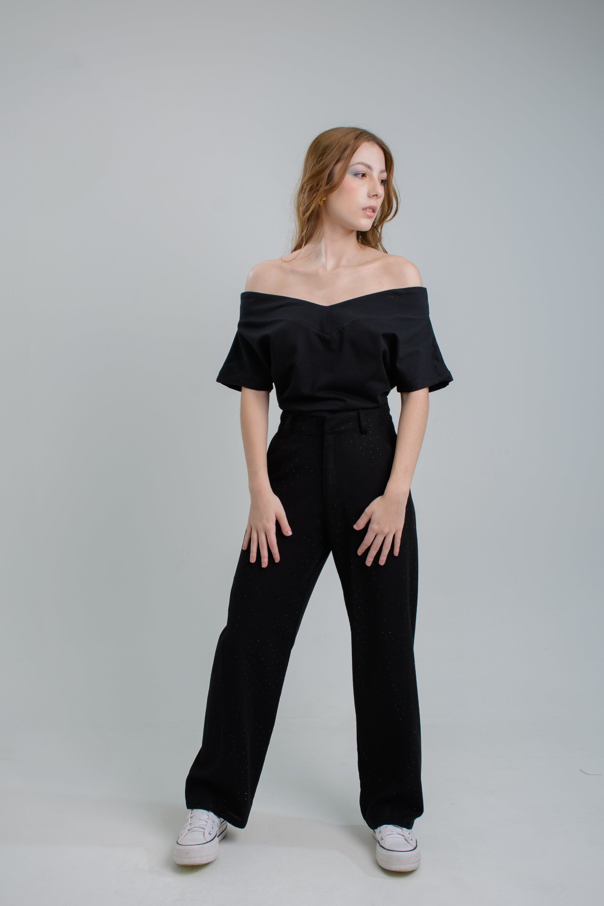 Nuestro Pantalón Noche es un pantalón de corte recto y cintura alta con una silueta fluida que alarga la figura sin perder estructura.