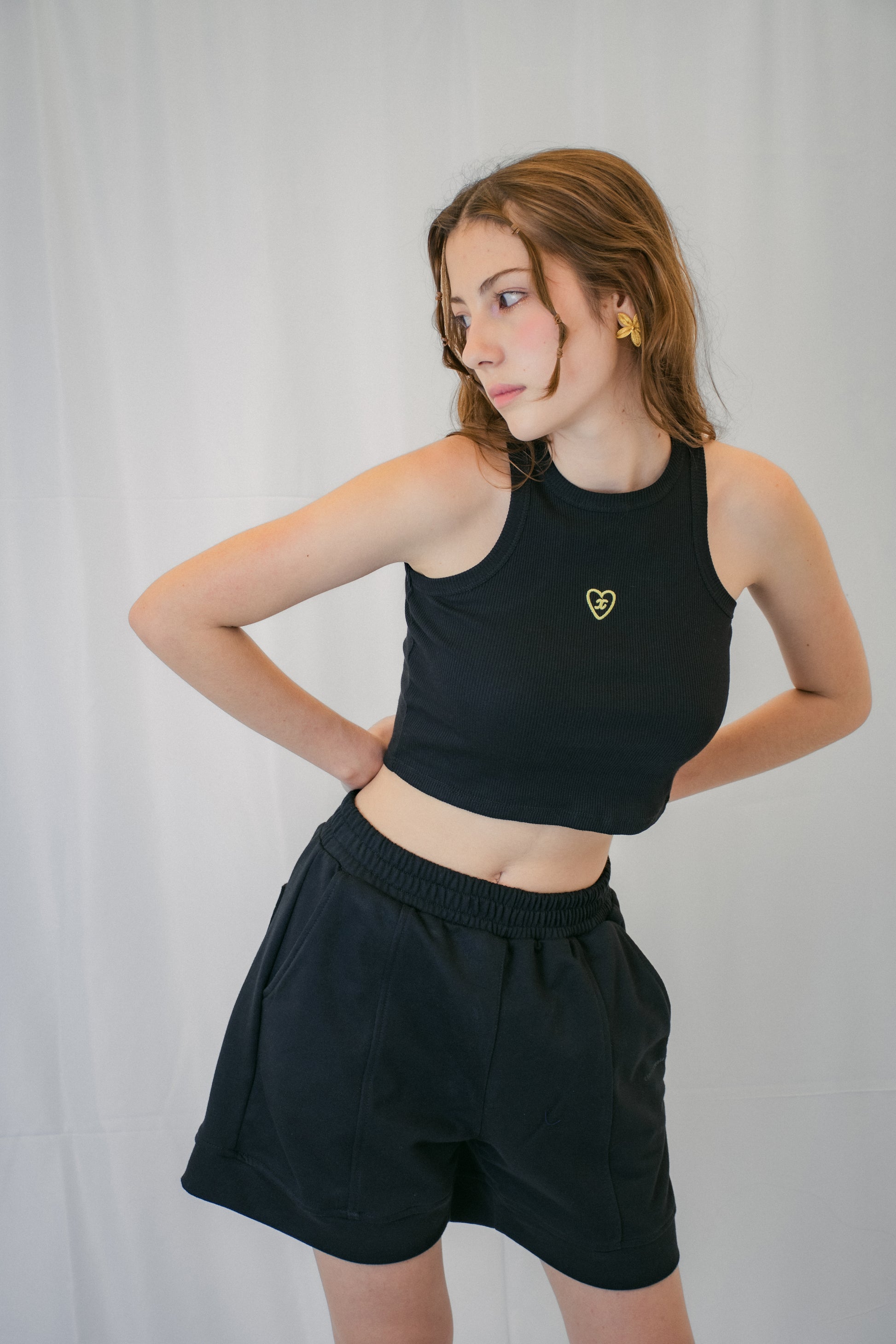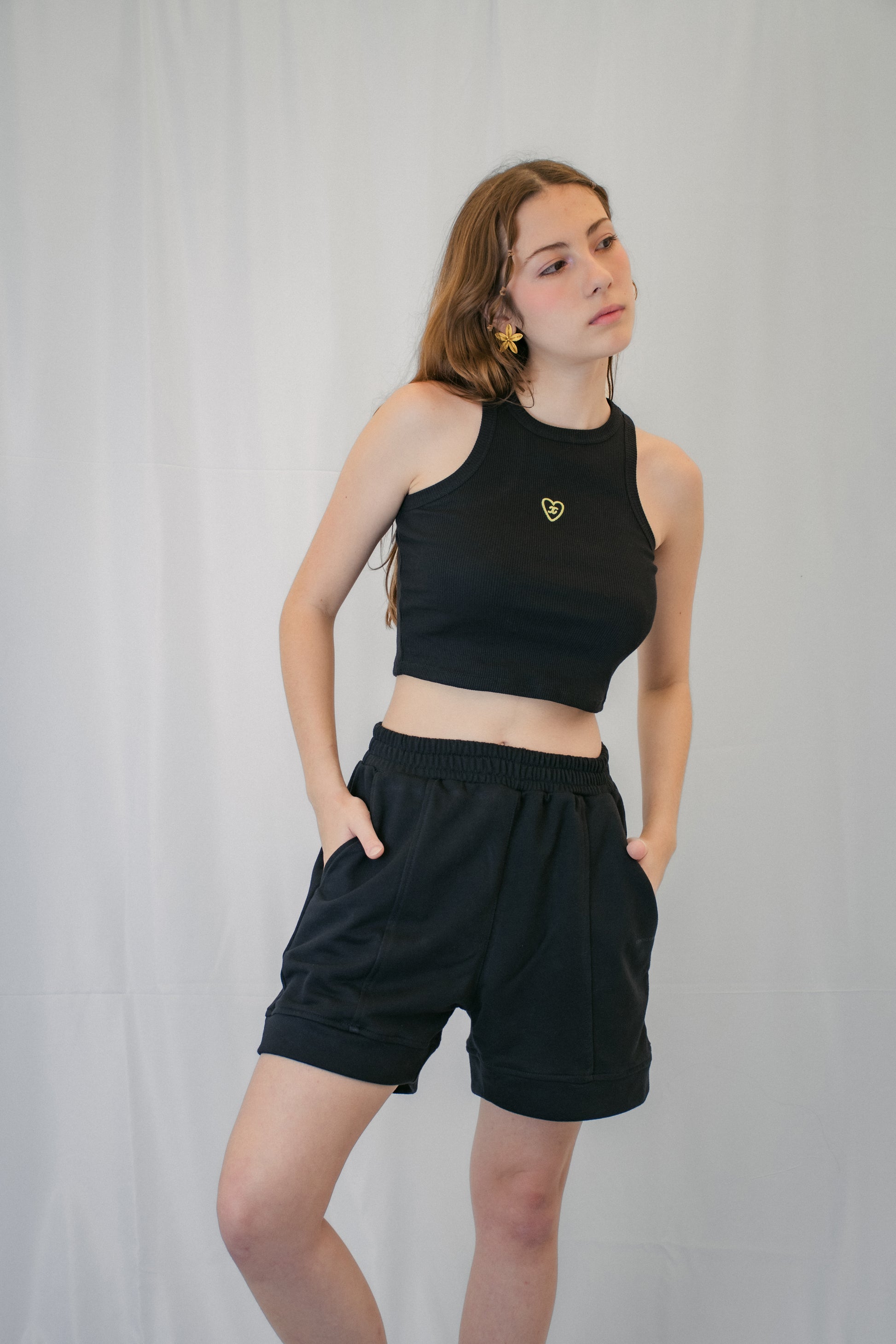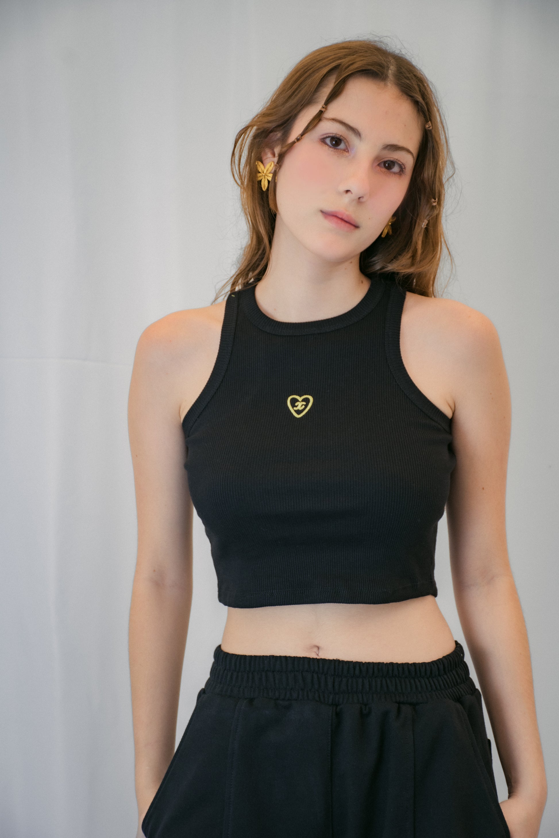 Nuestro Tank Top Corazón Black es un top de silueta ajustada y corte al cuerpo, su escote redondo y sisa americana estilizan la figura.