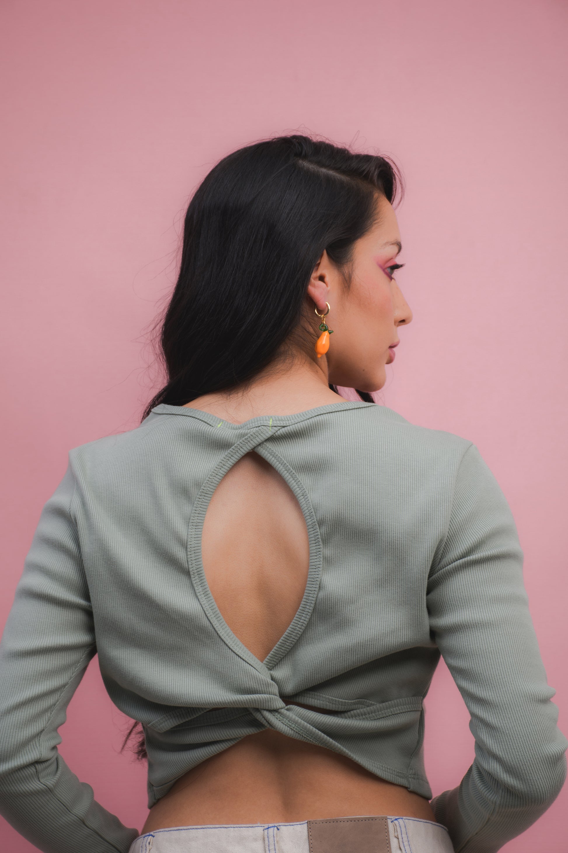 Descripción de producto • Textil: RIB algodón 100% • Silueta corta y ajustada • Aberturas en los hombros • Espalda con twist central y abertura ovalada • Manga larga