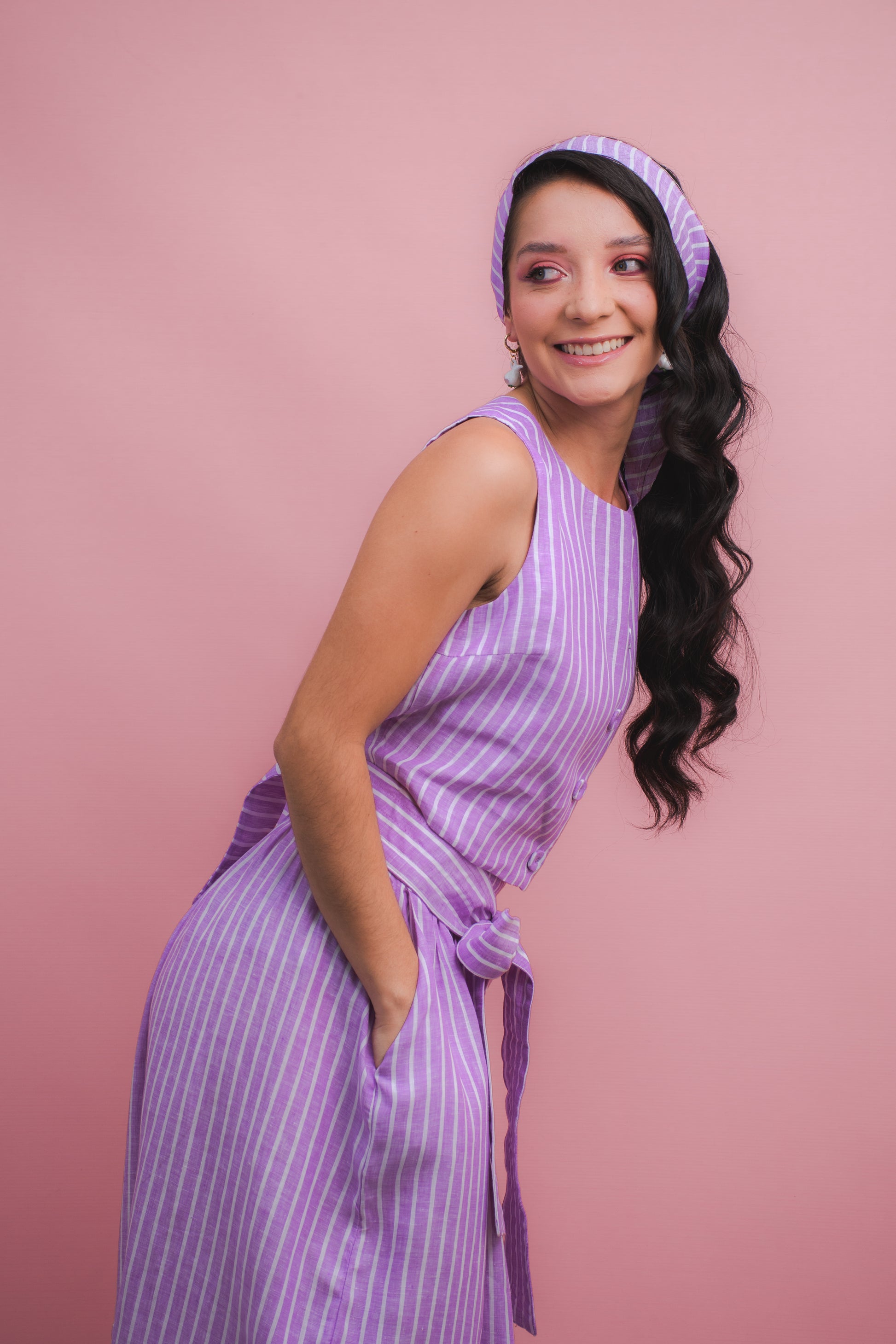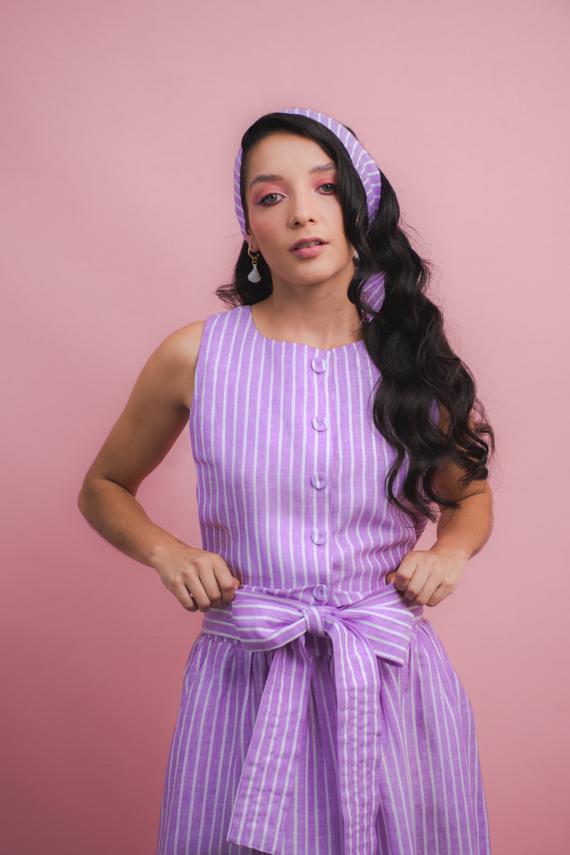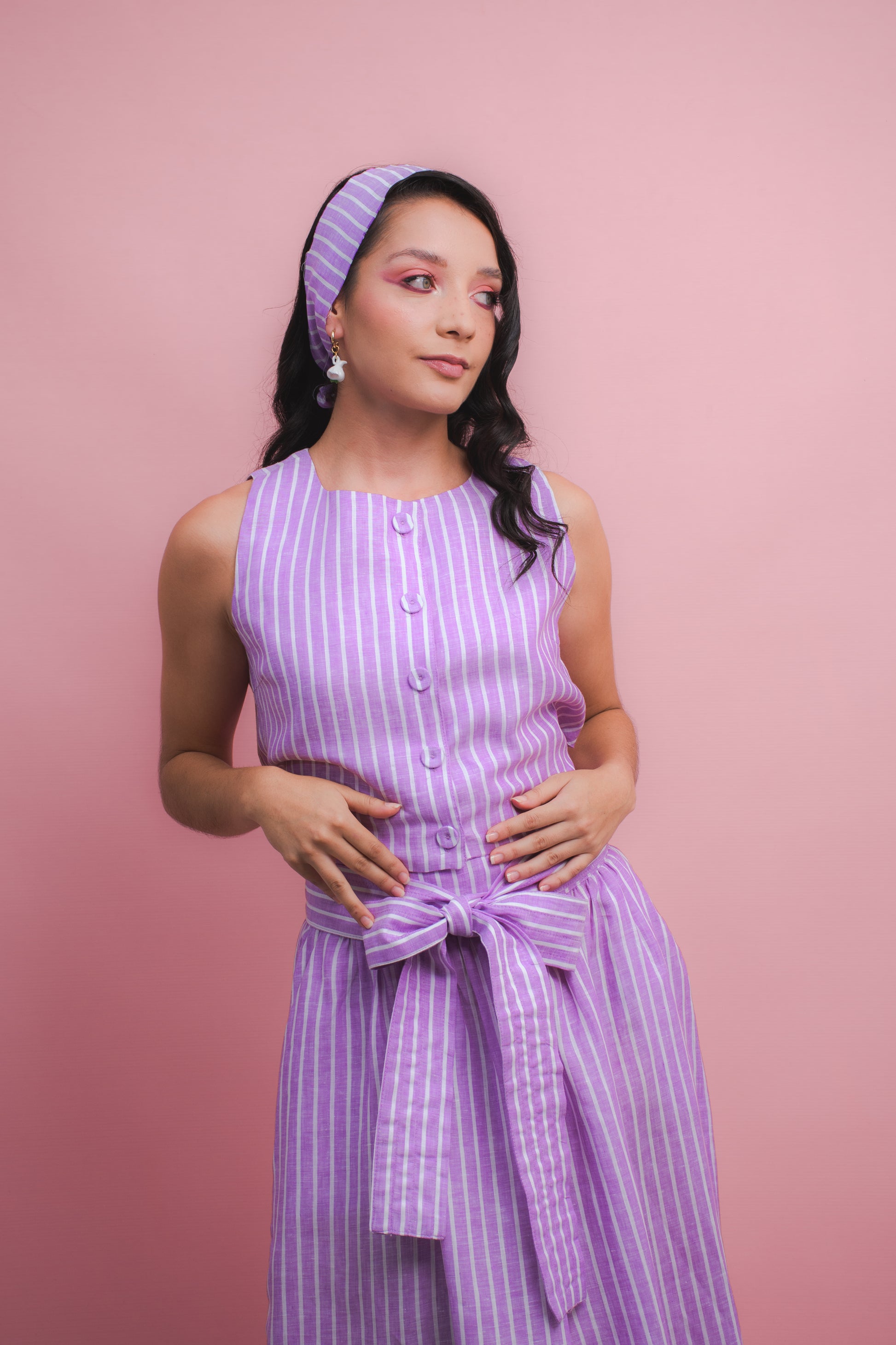 Nuestro Top Esencia es la reinterpretación del chaleco clásico. Este Top mezcla estructura y frescura a través de un diseño sin mangas, botones forrados al frente y un lazo ajustable en la espalda que le aporta carácter y versatilidad, juega con el sentido vertical de las rayas para estilizar la silueta y resaltar el movimiento natural del textil 100% lino. El lazo posterior no solo acentúa la cintura, sino que genera un contraste visual inesperado: estructura al frente, fluidez y detalle en la espalda.