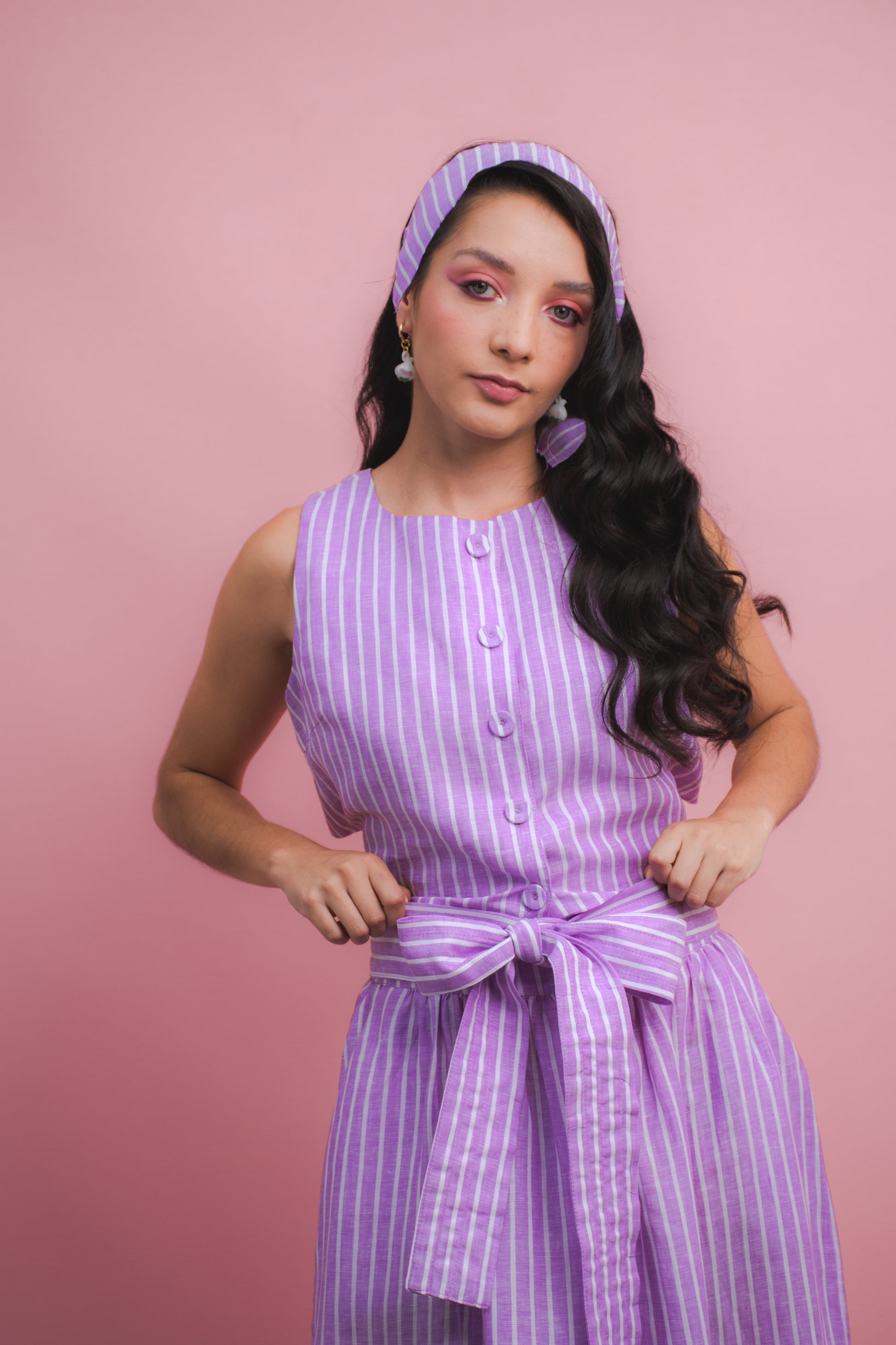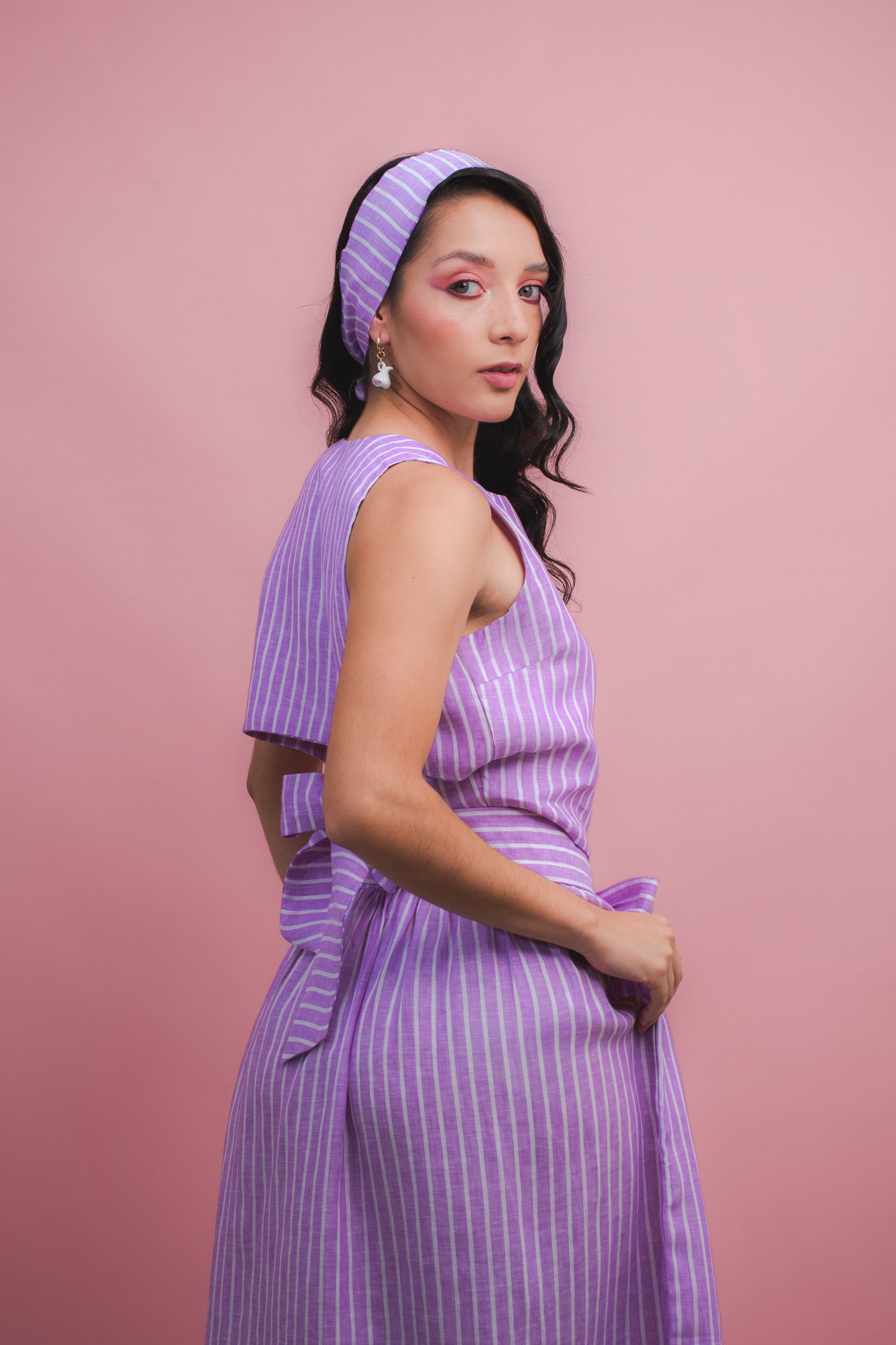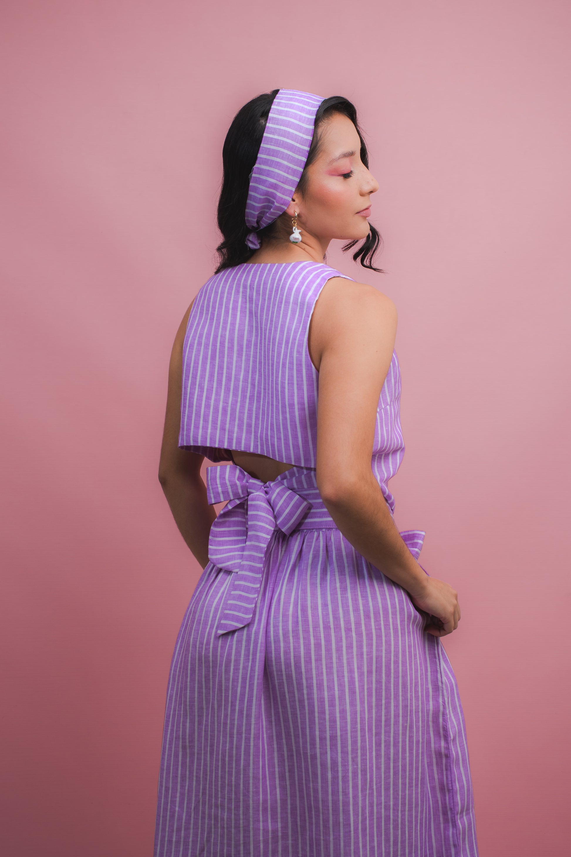 Nuestro Top Esencia es la reinterpretación del chaleco clásico. Este Top mezcla estructura y frescura a través de un diseño sin mangas, botones forrados al frente y un lazo ajustable en la espalda que le aporta carácter y versatilidad, juega con el sentido vertical de las rayas para estilizar la silueta y resaltar el movimiento natural del textil 100% lino. El lazo posterior no solo acentúa la cintura, sino que genera un contraste visual inesperado: estructura al frente, fluidez y detalle en la espalda.