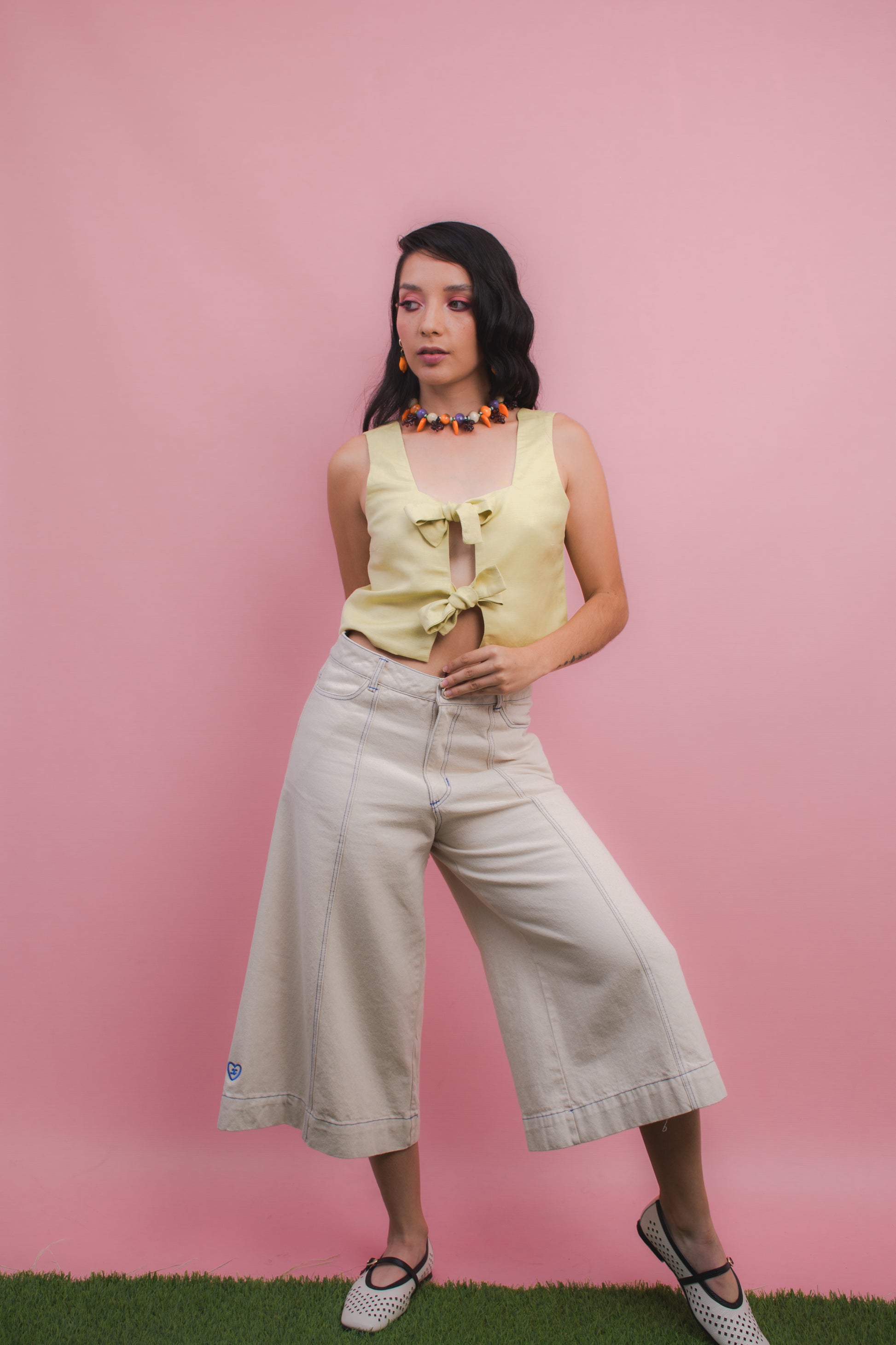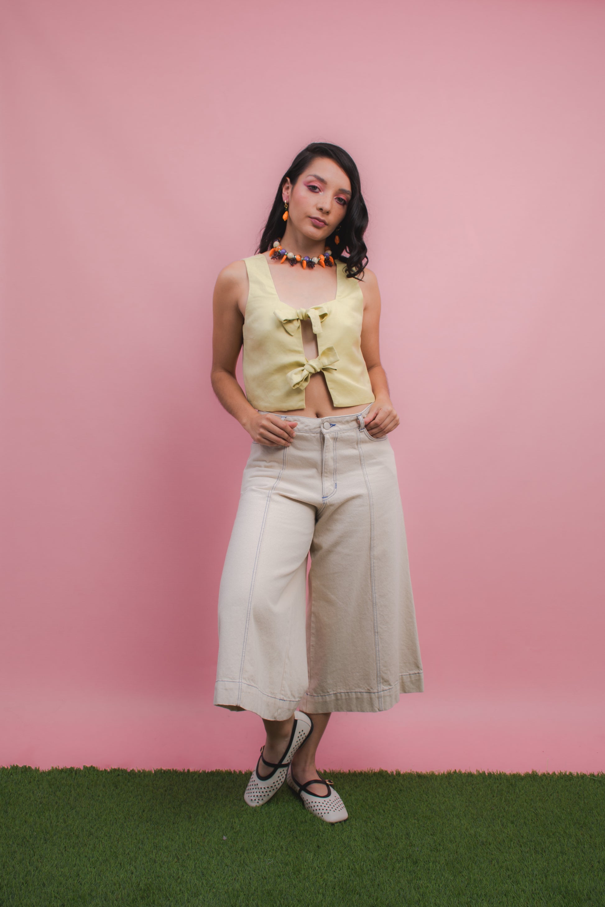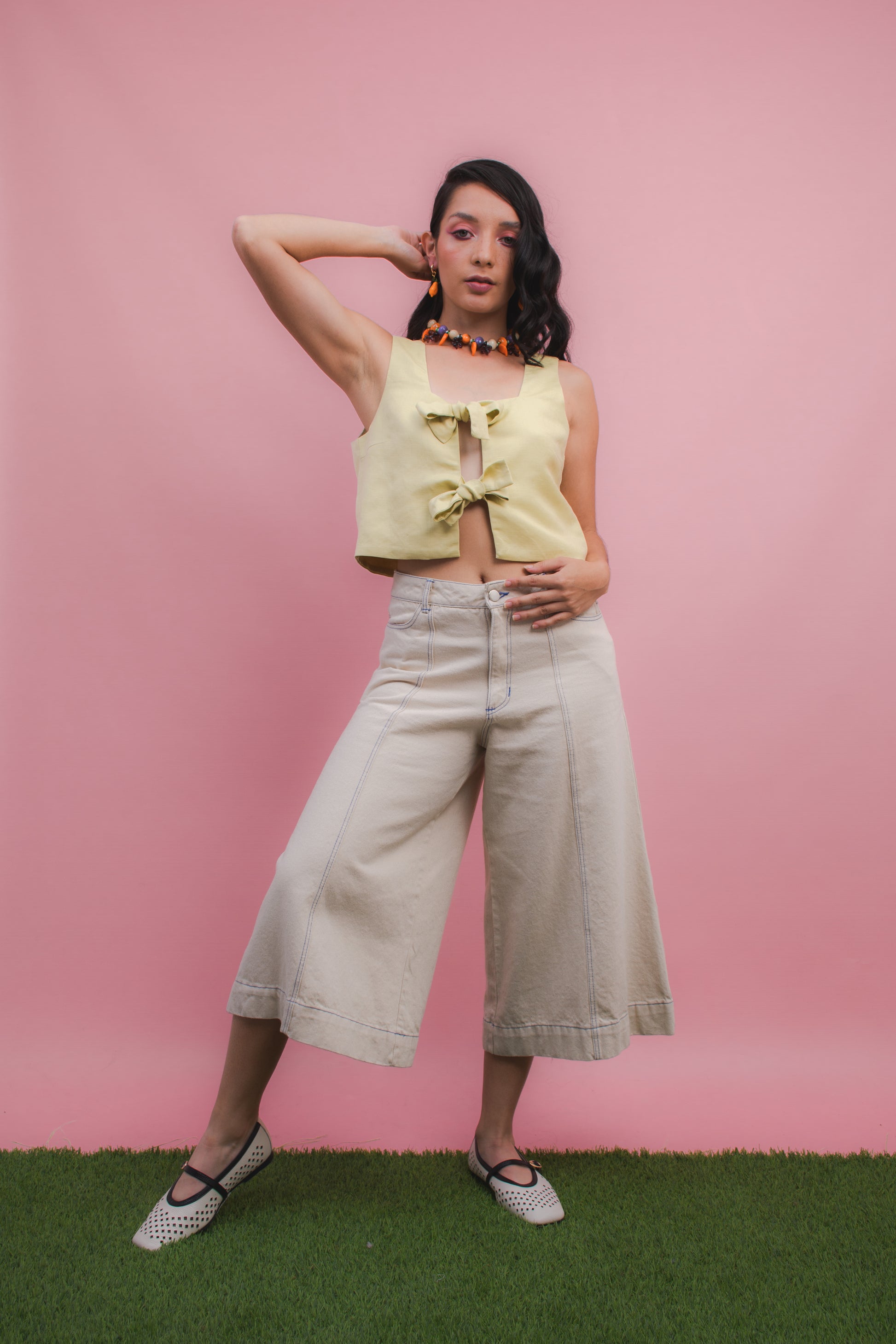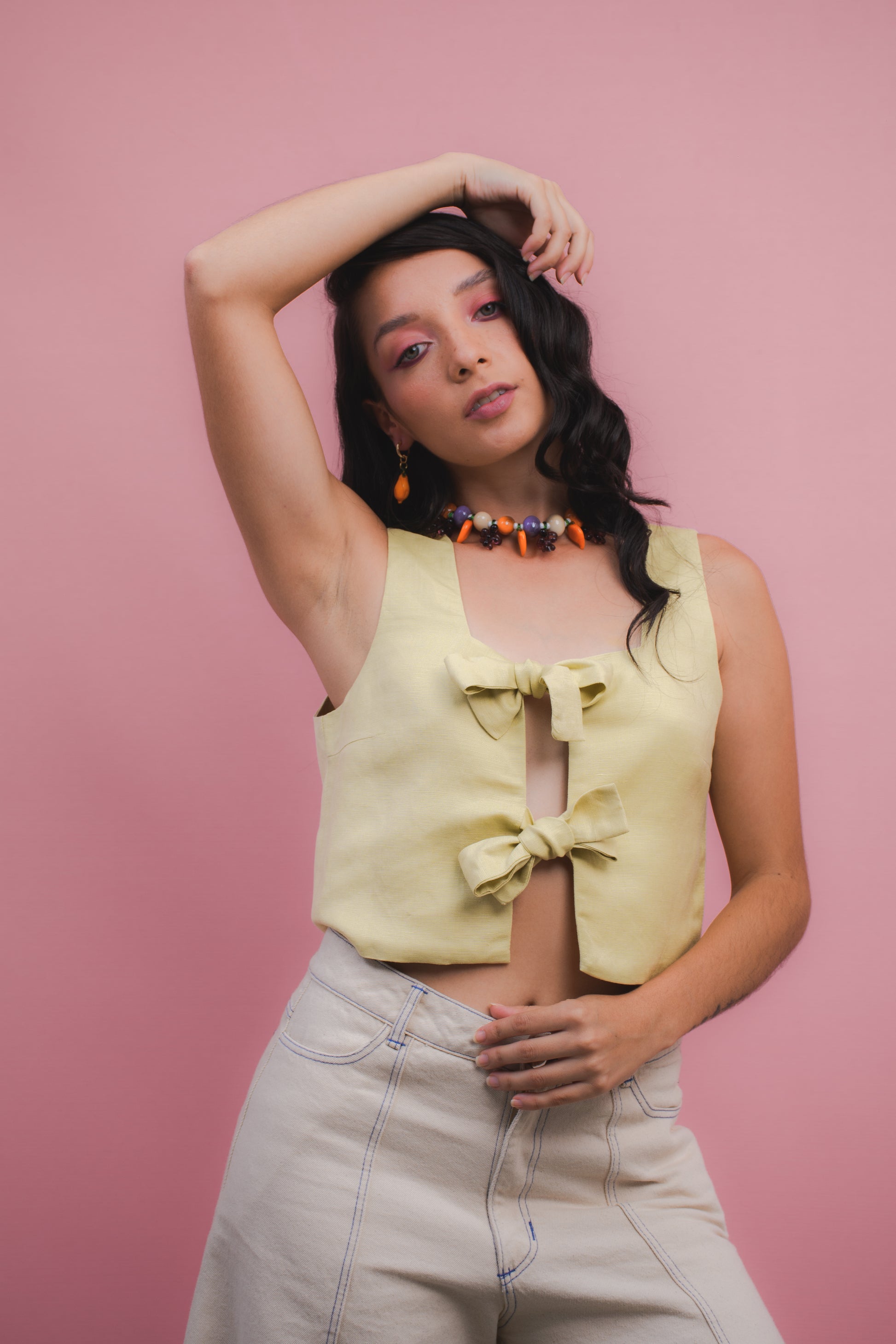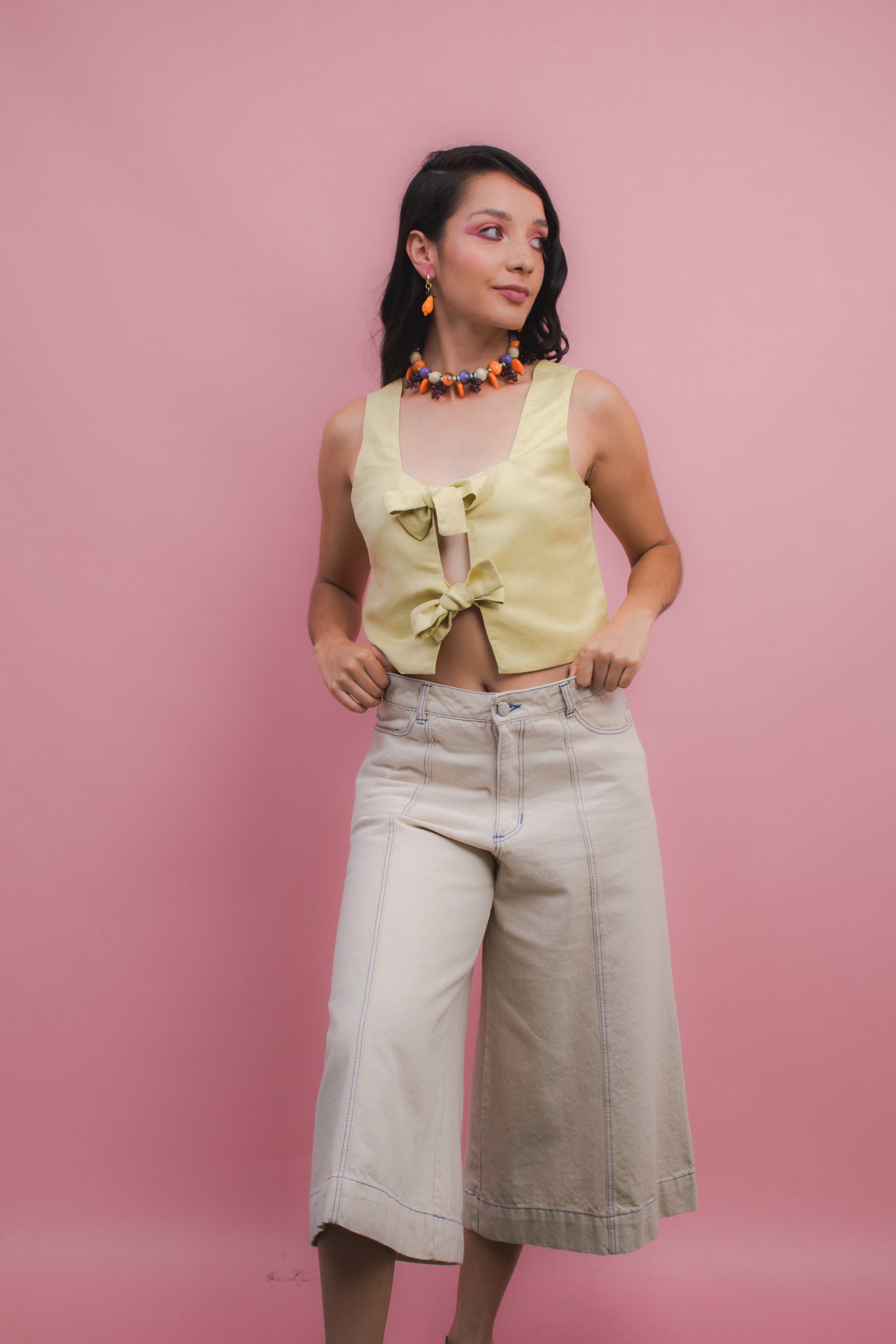 Nuestra Top Lazos Mantequilla es una prenda fresca que combina comodidad y diseño. Su silueta corta en algodón con franjas lilas y blancas destaca por los dos lazos frontales en lino lila.
