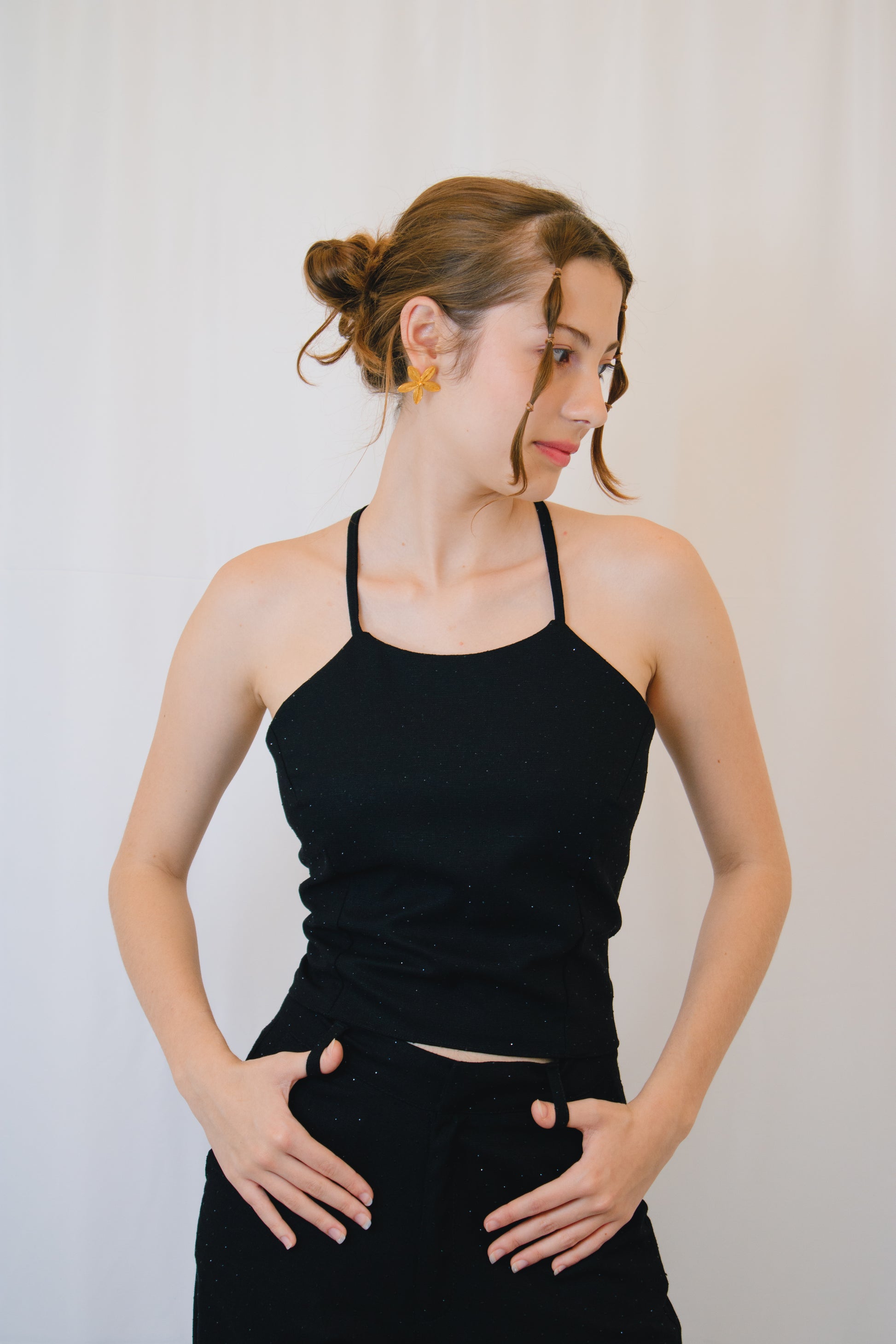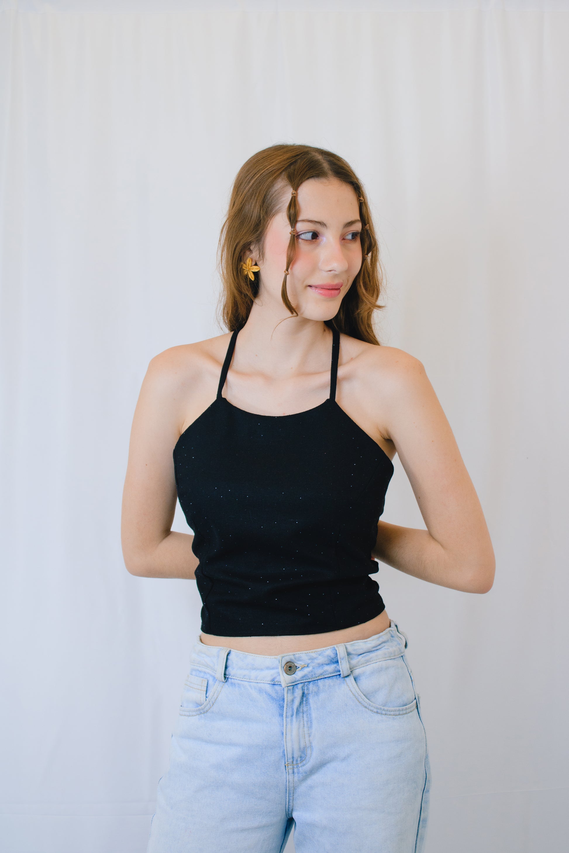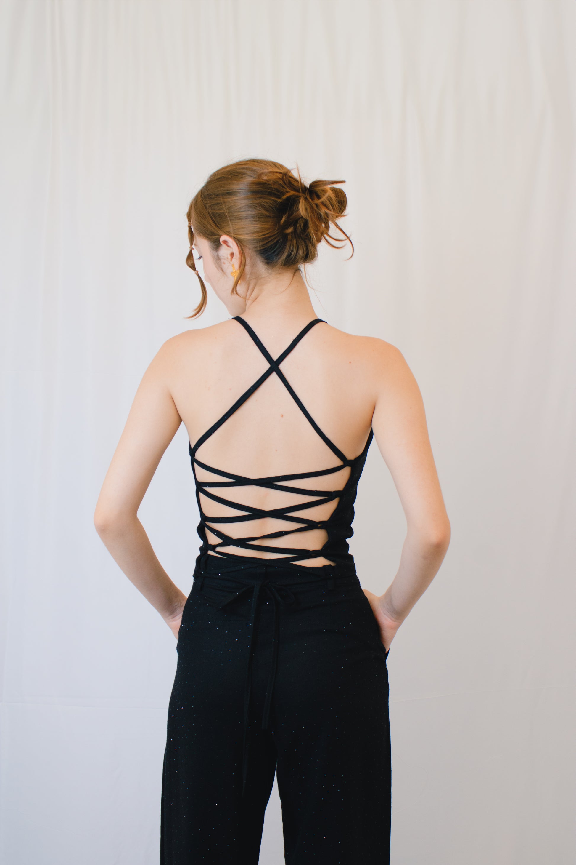 Nuestro Top Noche destaca por una espalda descubierta, con tiras finas cruzadas, que permiten ajustar el calce a distintos cuerpos. Cuenta con escote recto en la parte delantera y  las tiras permiten versatilidad en el amarre, adaptándose con facilidad al contorno del torso.