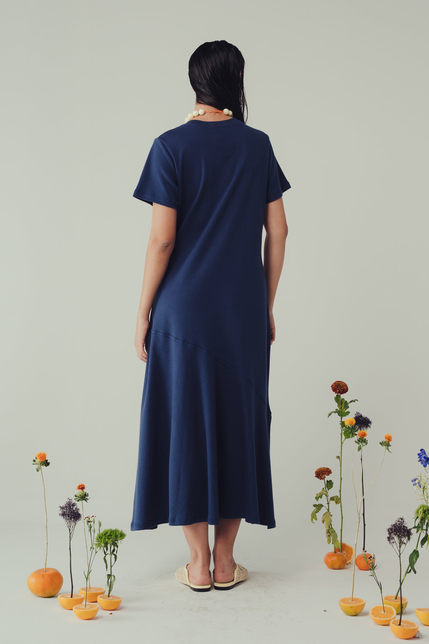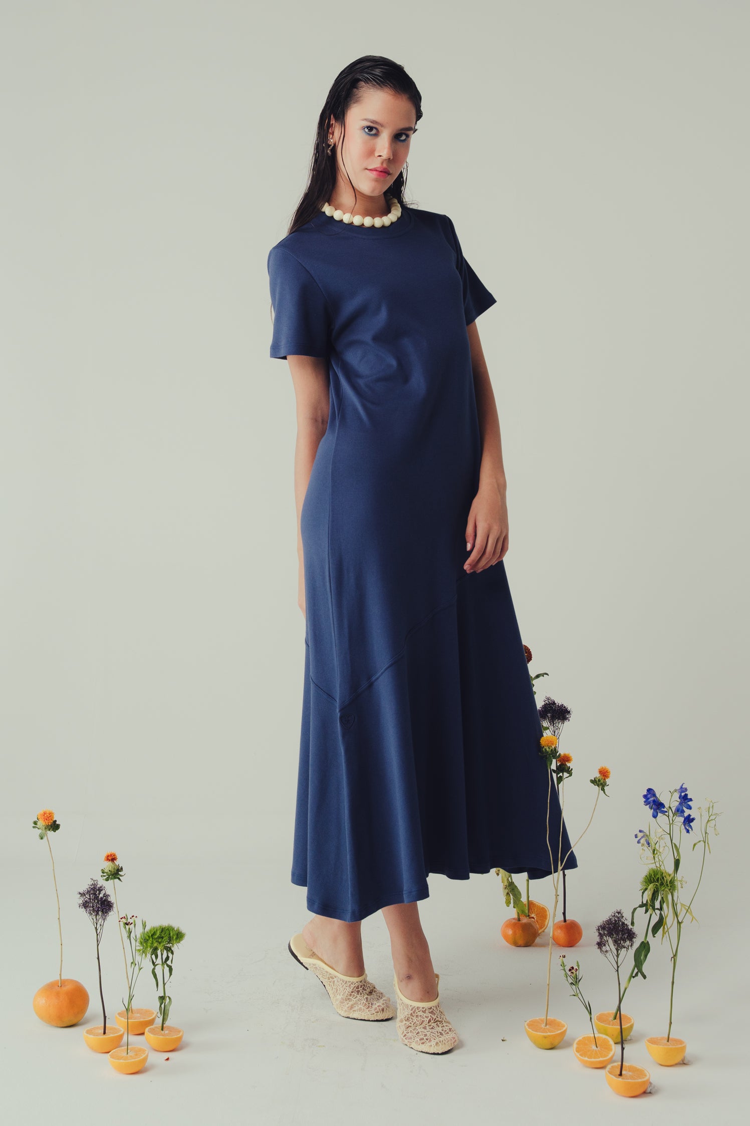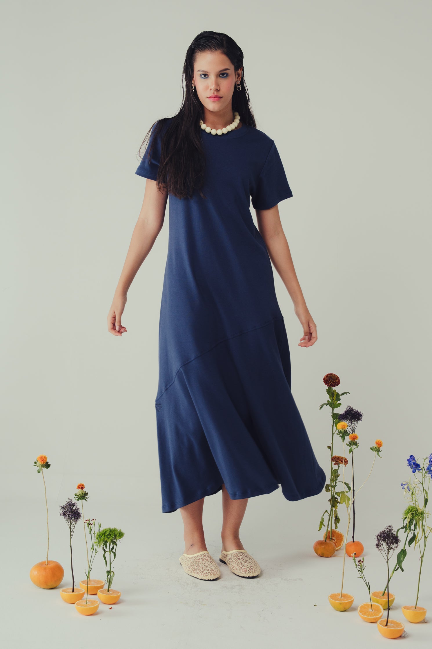 Nuestro Vestido Caudal Indigo es una prenda de silueta relajada que combina comodidad y estilo atemporal. Su diseño destaca por un recorte diagonal que aporta movimiento y dinamismo. Su moldería amplia cae naturalmente desde los hombros, con mangas cortas y escote redondo clásico. El ruedo con leve evasé permite fluidez en cada paso.